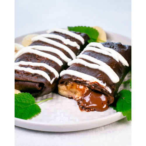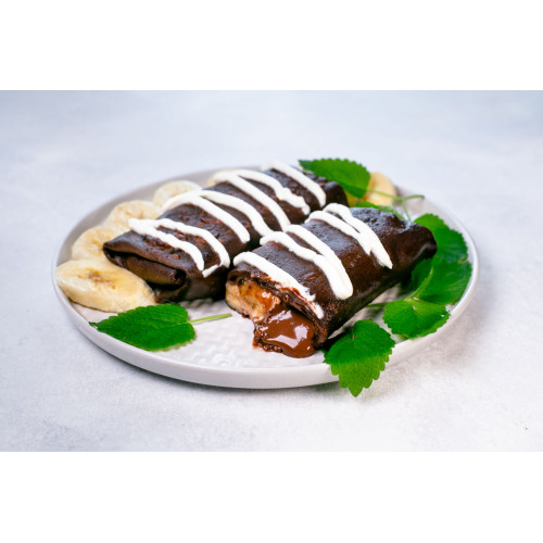 Chocolate Crepes with Cheese, Banana, and Nutella are rich dessert-style crepes with a decadent filling and a delicate cocoa batter. The base is made from milk, premium wheat flour, butter, chicken eggs, cocoa powder, vanilla paste, sugar and a pinch of salt, so the crepes fry up tender, elastic and pleasantly chocolatey.