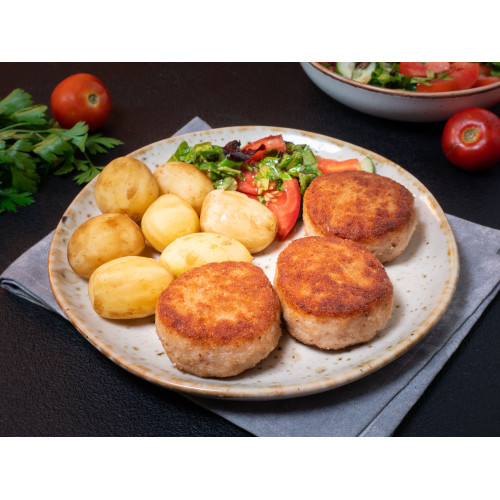 Chicken Cutlets are classic home-style chicken patties with a tender texture and clean, mild taste. The mixture is made from chicken fillet with bulb onion, long loaf and breadcrumbs, lightly seasoned with chicken eggs, salt and ground black pepper. After cooking, the cutlets are golden and slightly crispy outside and remain juicy and soft inside.