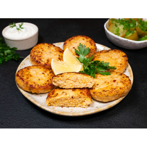 Salmon & Tilapia Fish Cutlets are light, tender fish patties made from a balanced mix of tilapia (42%) and salmon (18%). Grated carrot and onion add sweetness and juiciness, while refined sunflower oil, olive oil, salt and ground chili pepper give a delicate texture and a mild spicy note.