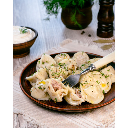 Thanks to the combination of three types of meat and pork fat, the filling stays tender and succulent after cooking. Fresh dill and ground black pepper add aroma, while refined sunflower oil helps keep the texture soft and pleasant. Pelmeni are delivered frozen and cook in just 5–7 minutes in boiling salted water – an easy way to serve a hot, satisfying meal for the whole family.