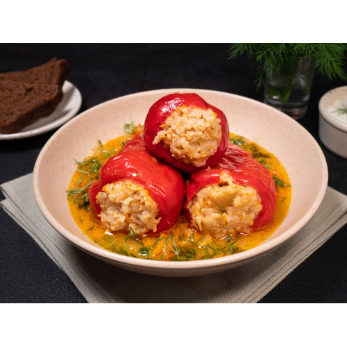 These meat-stuffed bell peppers are prepared in a classic home-style way: sweet bell peppers are generously filled with a juicy mix of half-fat pork, pork fat, tender boiled rice and sautéed vegetables. The result is a rich, aromatic dish that turns into a full hot meal with minimal effort.
