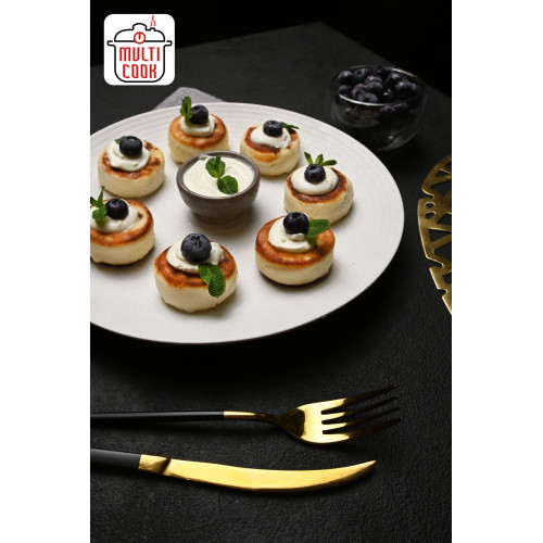 Syrnyky (cheese pancakes) are classic Ukrainian cheese pancakes with a modern twist – tender inside. The base is sour milk cheese mixed with white granulated sugar, egg yolks, premium wheat flour, vanilla sugar and a pinch of salt, and then enriched for an extra dessert feel.